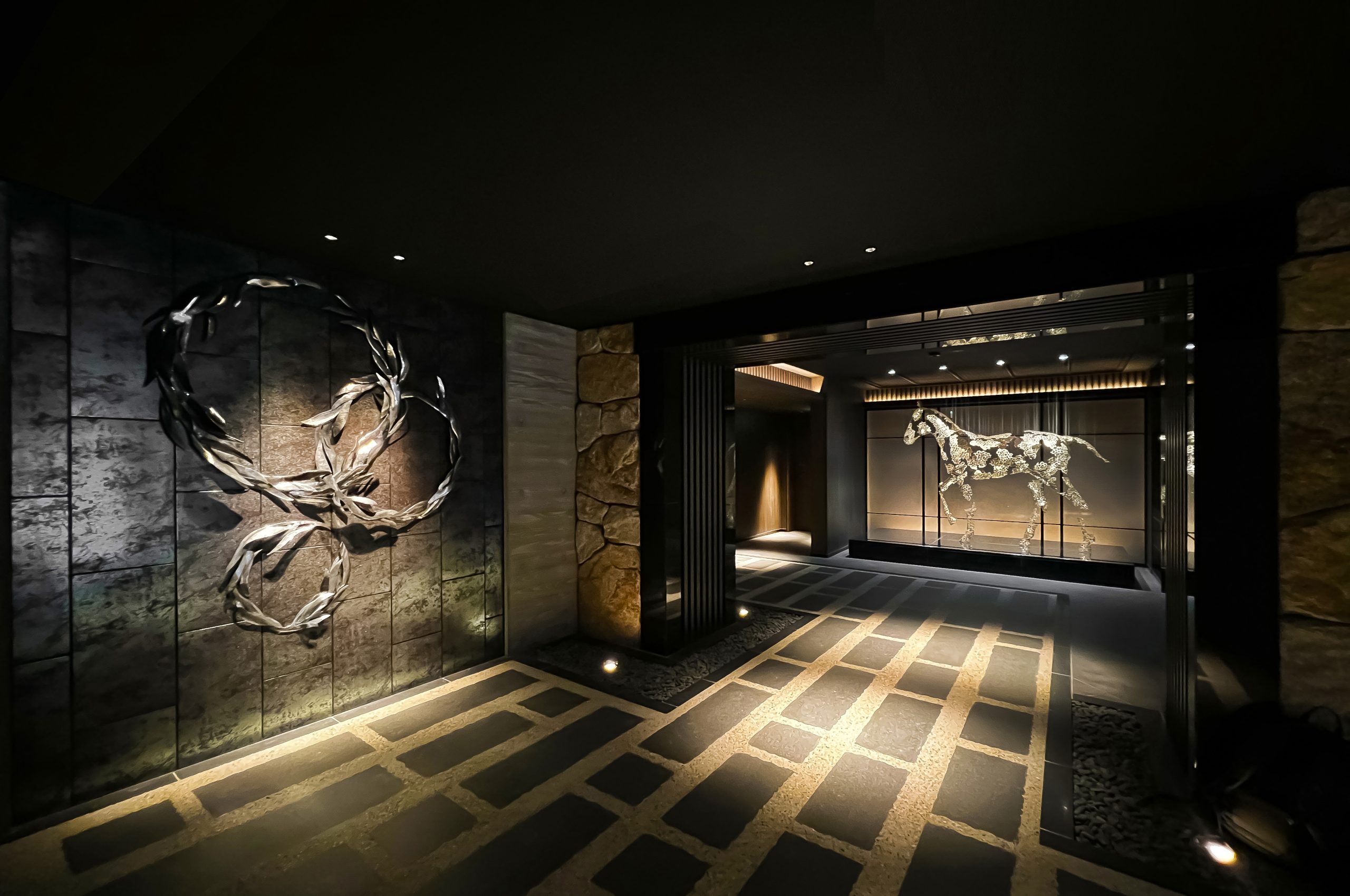 京都市内の柳馬場通にある新築マンションのデザインを手掛けました。マンションが建っている場所は、かつて柳の道を馬が駆け抜けていったと言われています。マンションの共用部は当時の路地を表現し、柳や馬をモチーフにしたアートをデザインしました。床は石畳をイメージし、屋外にいる雰囲気を演出するために天井は黒にして存在感を消しています。ラウンジからは石庭を眺めることもできます。