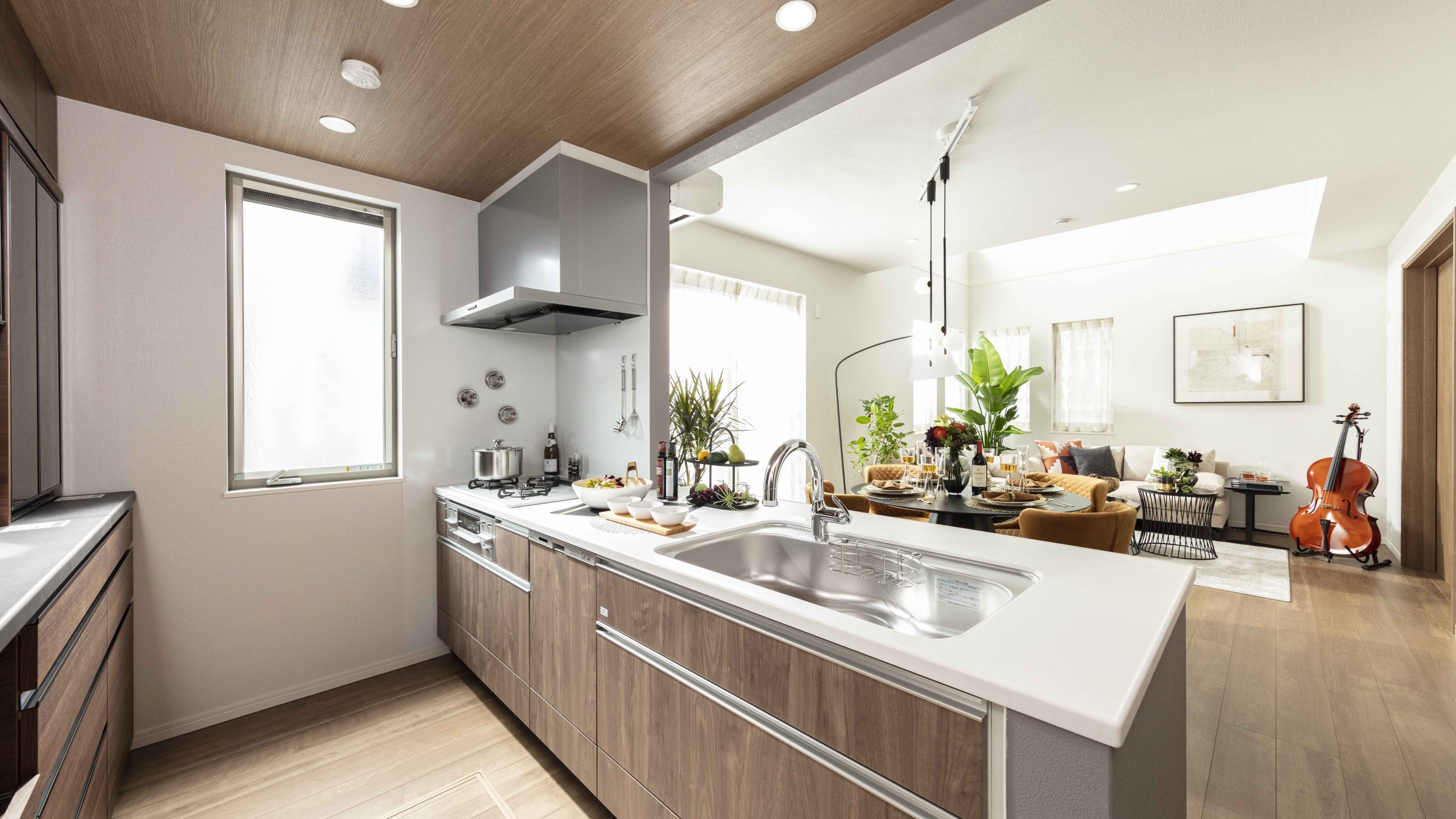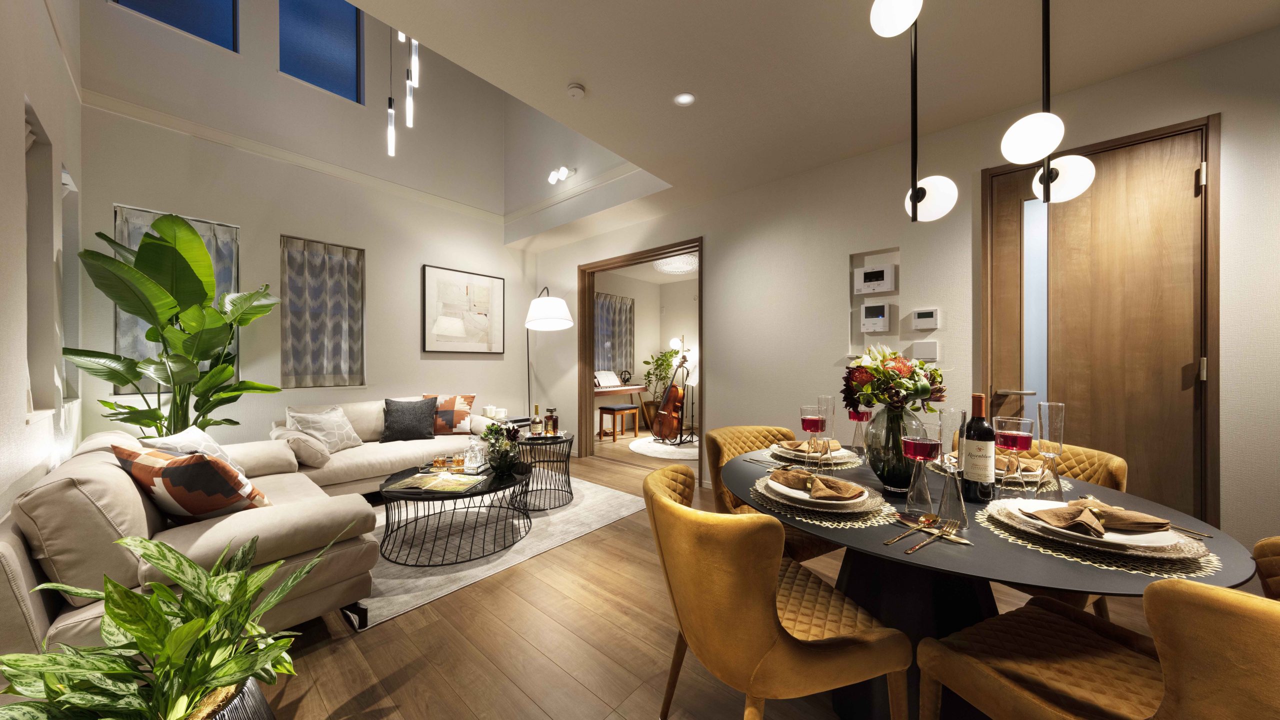 HALF MODEL ROOMはノーブルでオーセンティックなウォールナットの空間にゴールドや真鍮・ガラスなどの華やかさもプラス。ワンランク上の大らかで落ち着く空間を演出した。