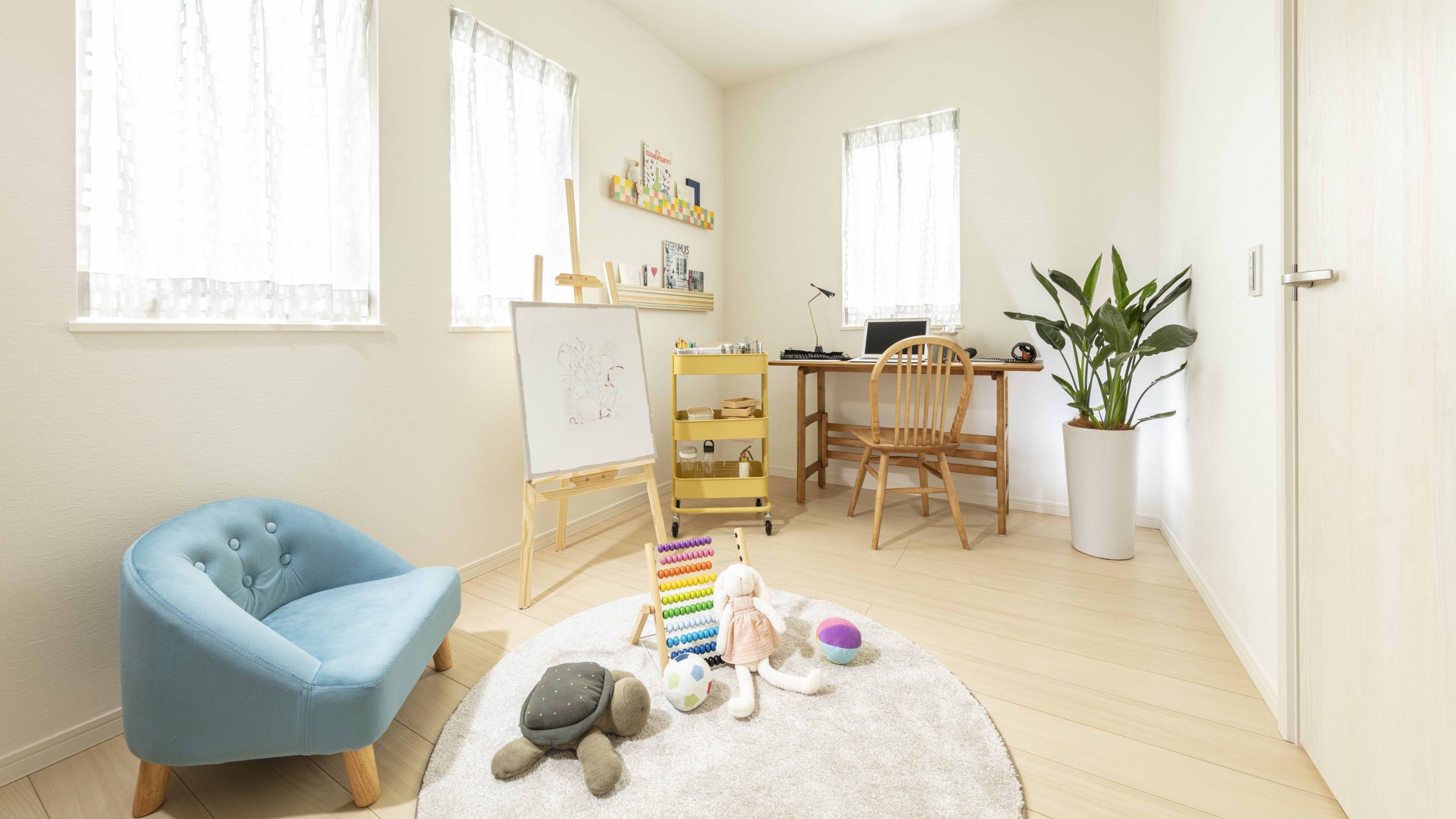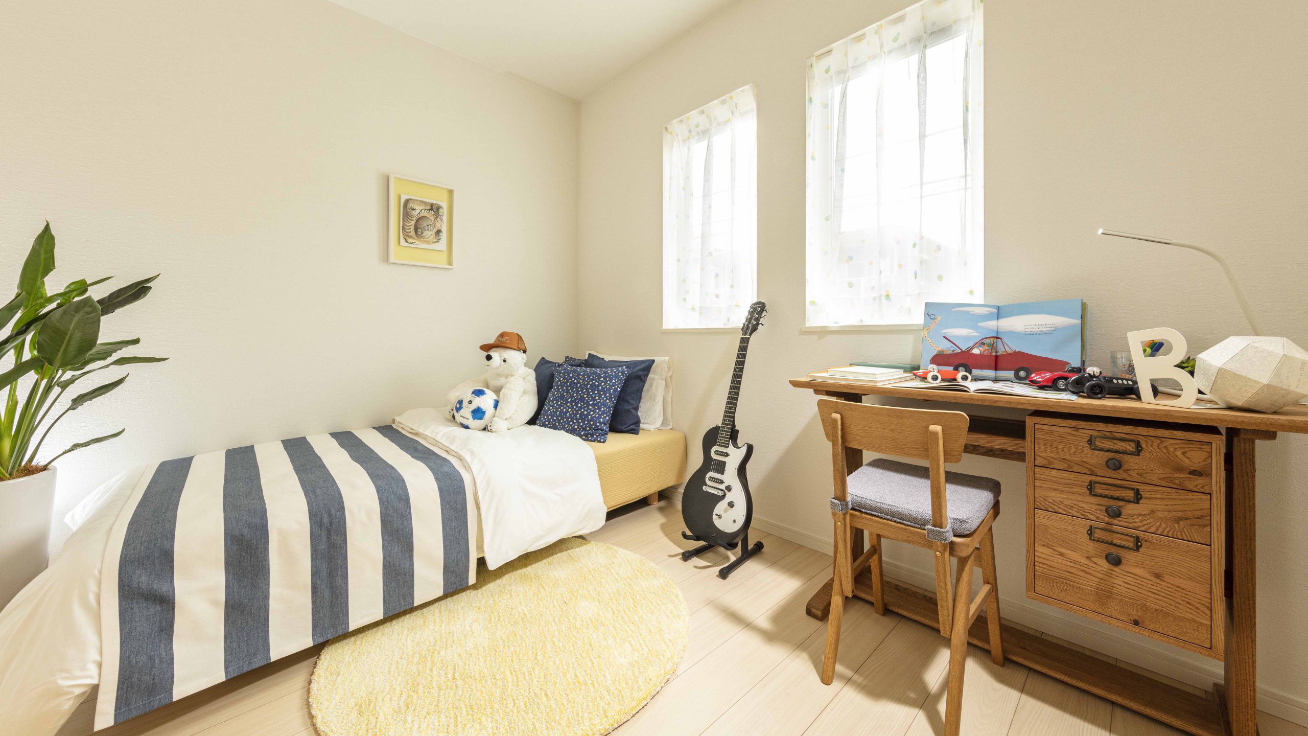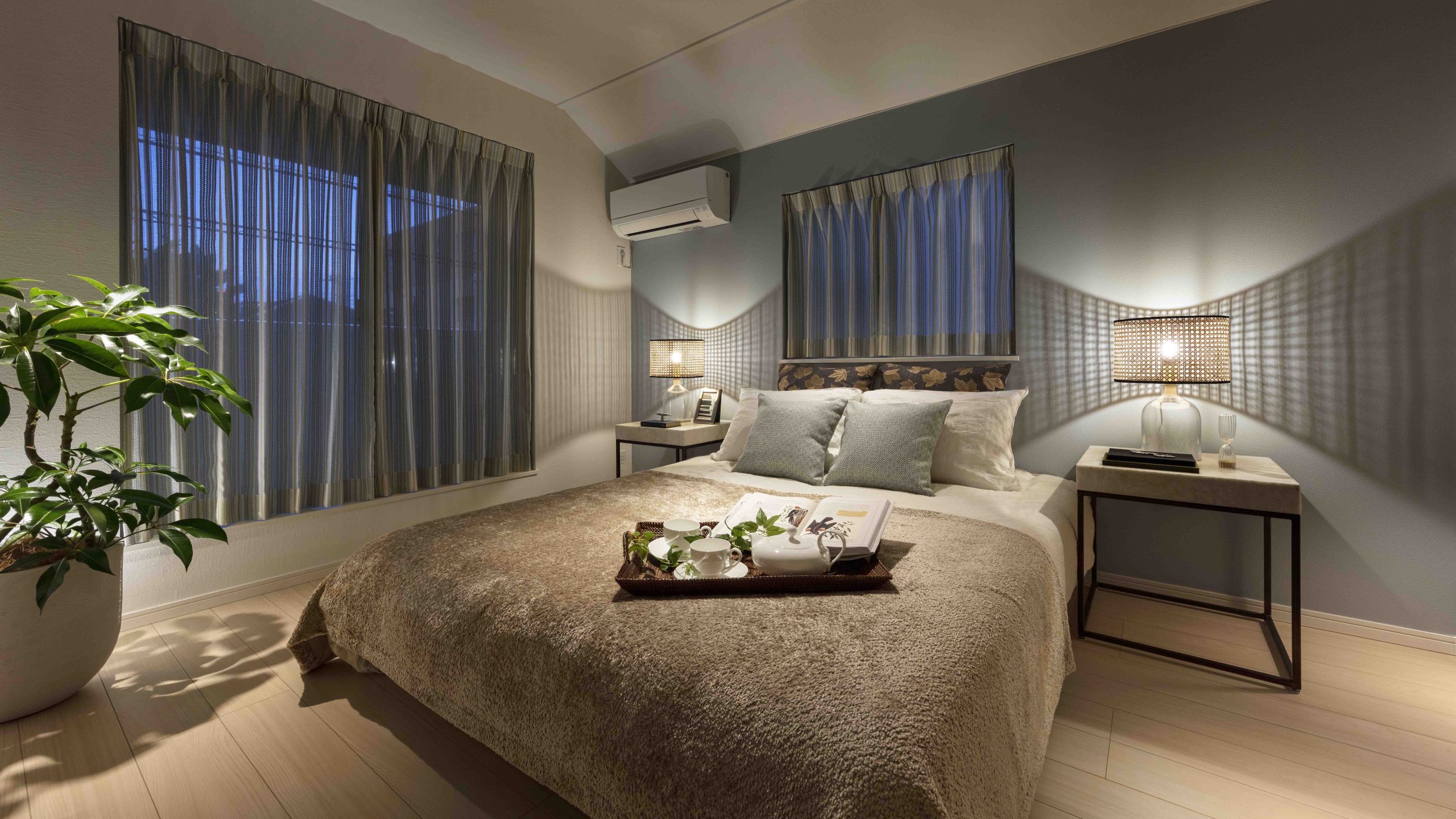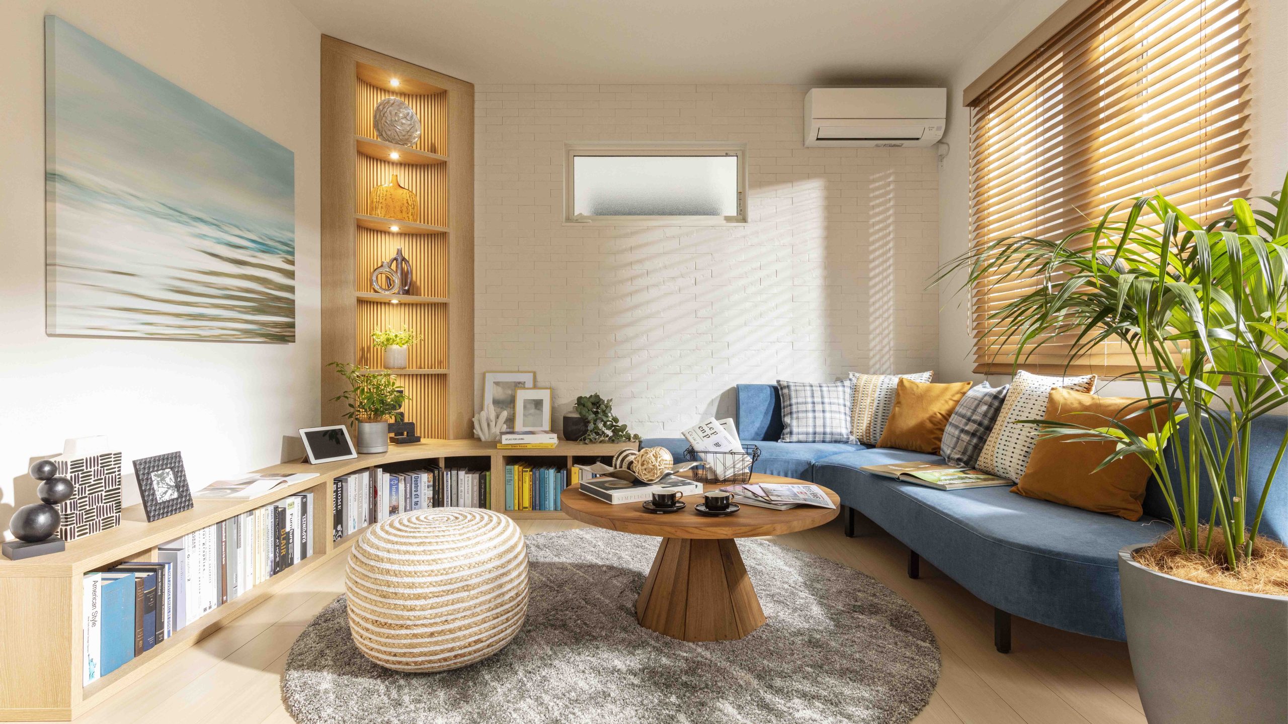 FULL MODEL ROOMはマテリアルやアクセントに爽やかなカラーを取り入れ、素材感のある小物を採用。上品で洗練された西海岸スタイルの空間を表現した。