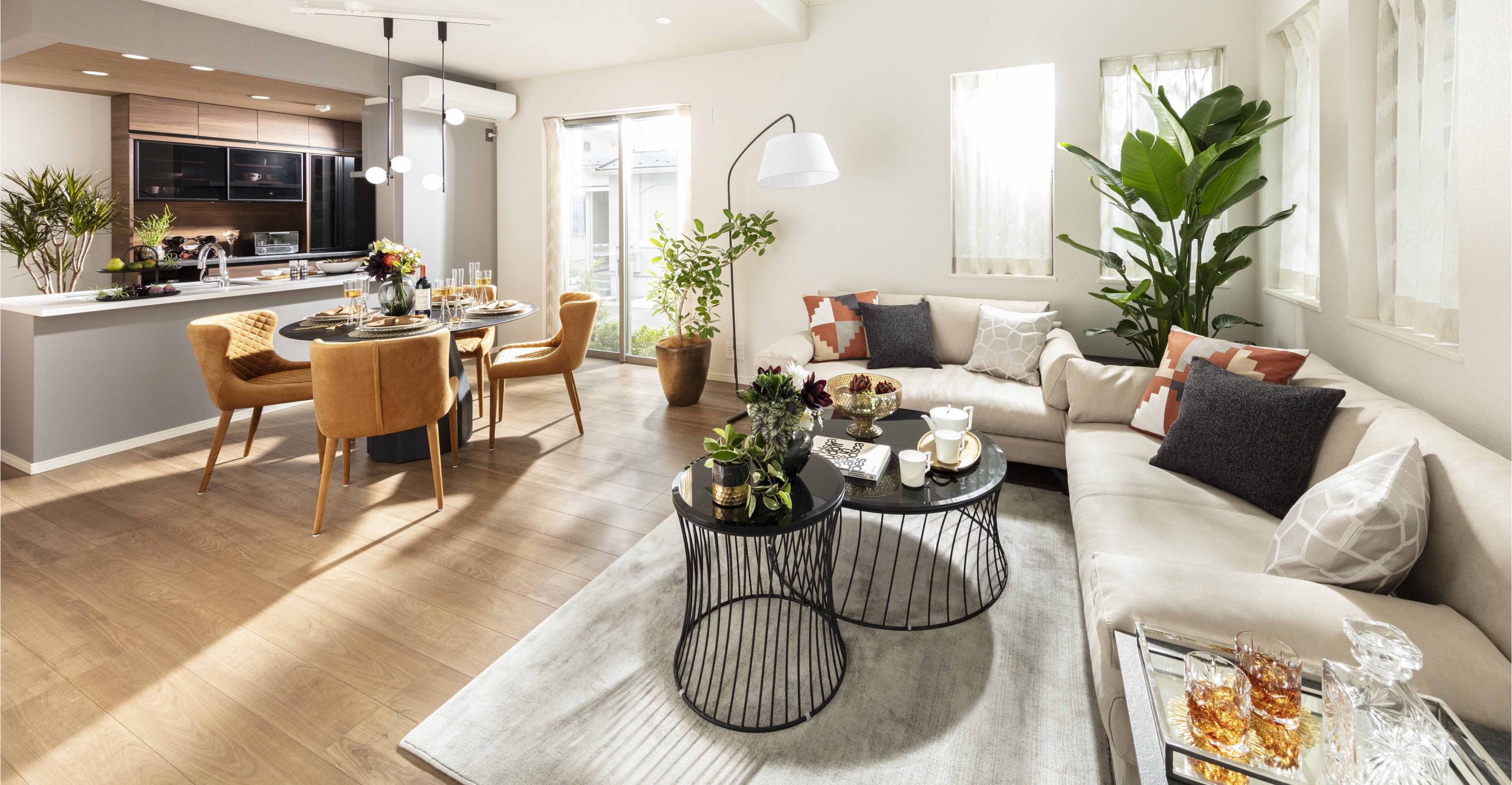 HALF MODEL ROOMはノーブルでオーセンティックなウォールナットの空間にゴールドや真鍮・ガラスなどの華やかさもプラス。ワンランク上の大らかで落ち着く空間を演出した。