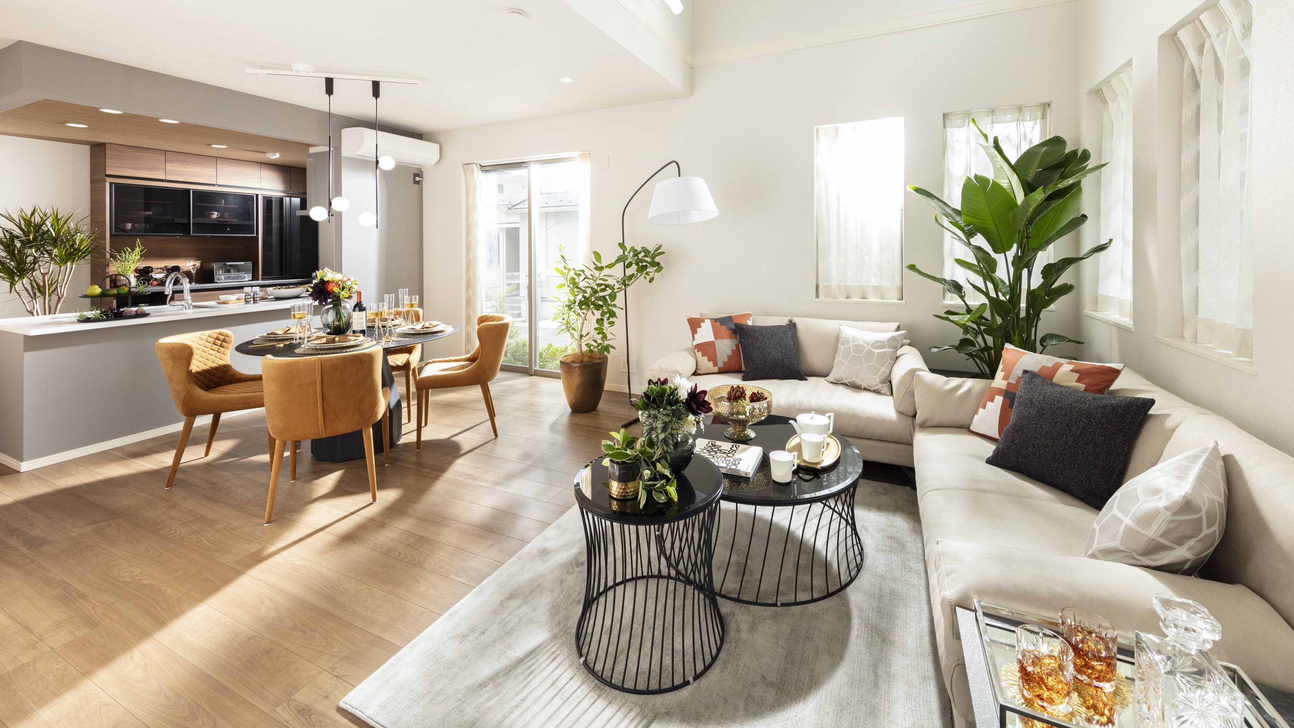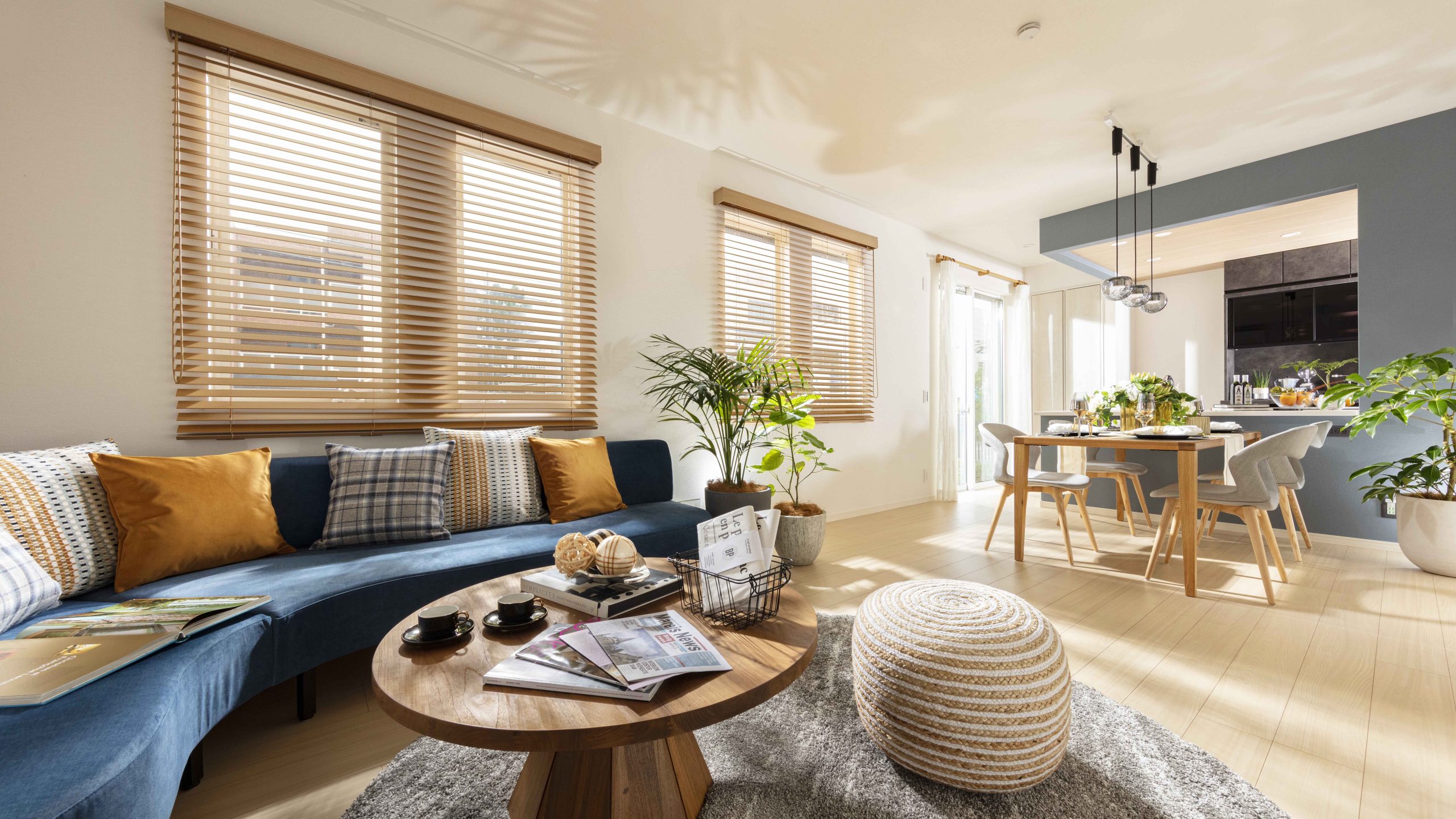 FULL MODEL ROOMはマテリアルやアクセントに爽やかなカラーを取り入れ、素材感のある小物を採用。上品で洗練された西海岸スタイルの空間を表現した。