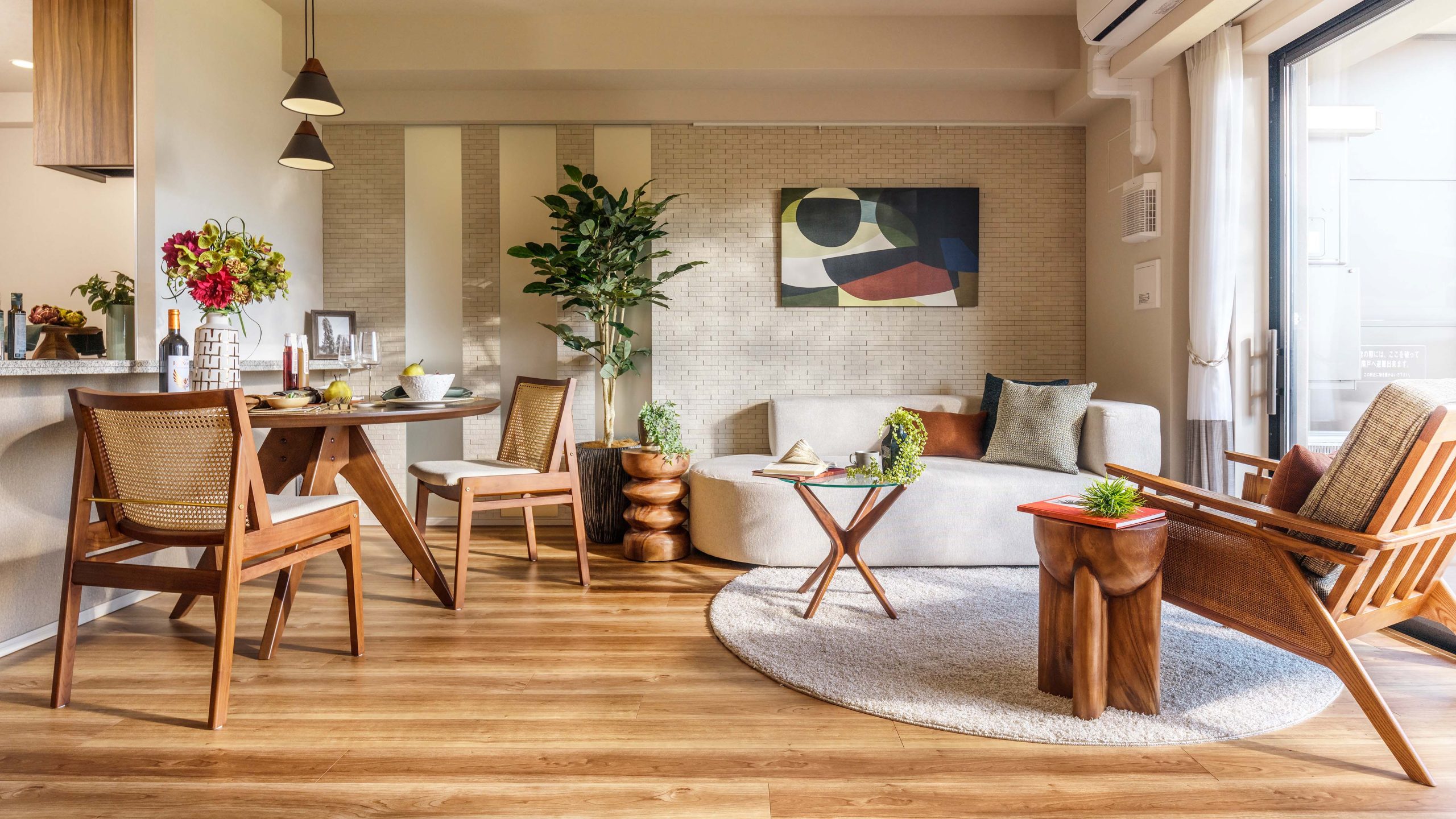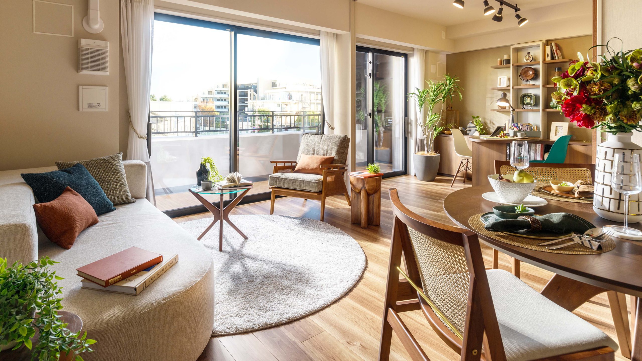 FULL MODEL ROOM ”Artisanal Comfort” __ ひとつひとつ、二人の好みで集めた家具や小物たち。 異なる個性をもつもの同士が作用し合い、不思議と居心地のよい空間を作り出す。 ビンテージ感やクラフト感、丸みを帯びたディテールの家具を中心に 住む人の個性が光るアートのような空間を目指した。