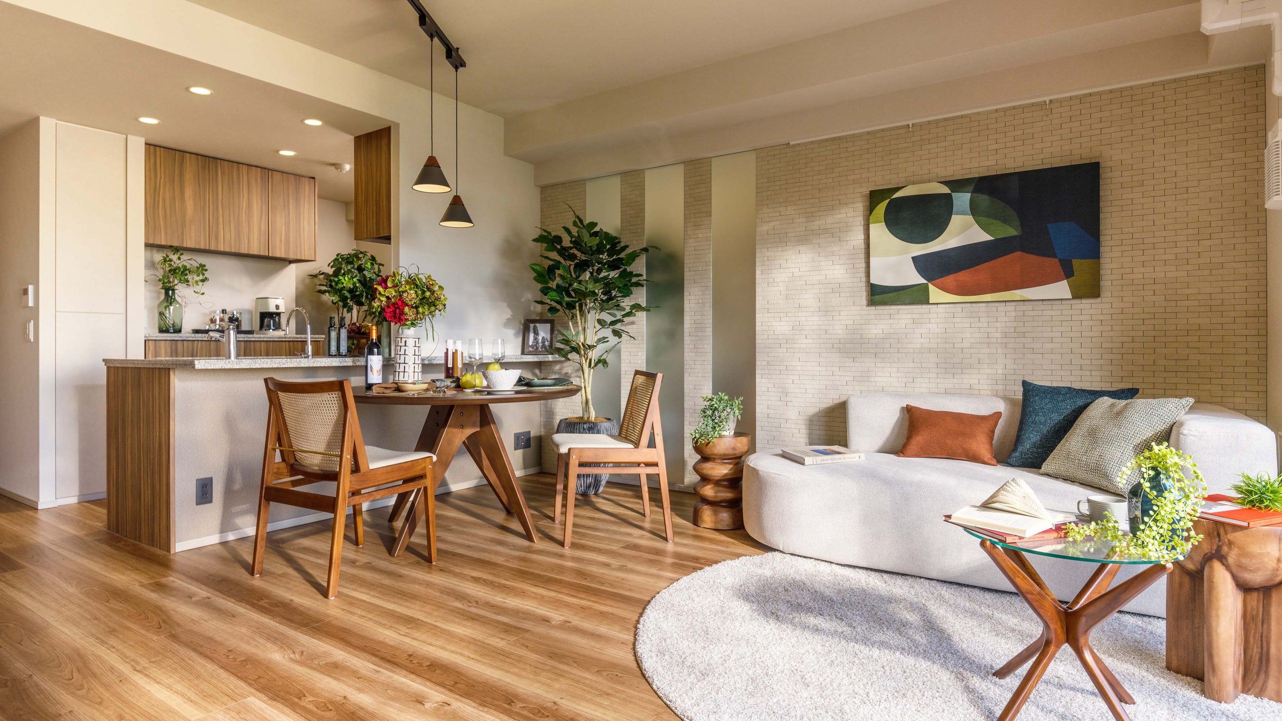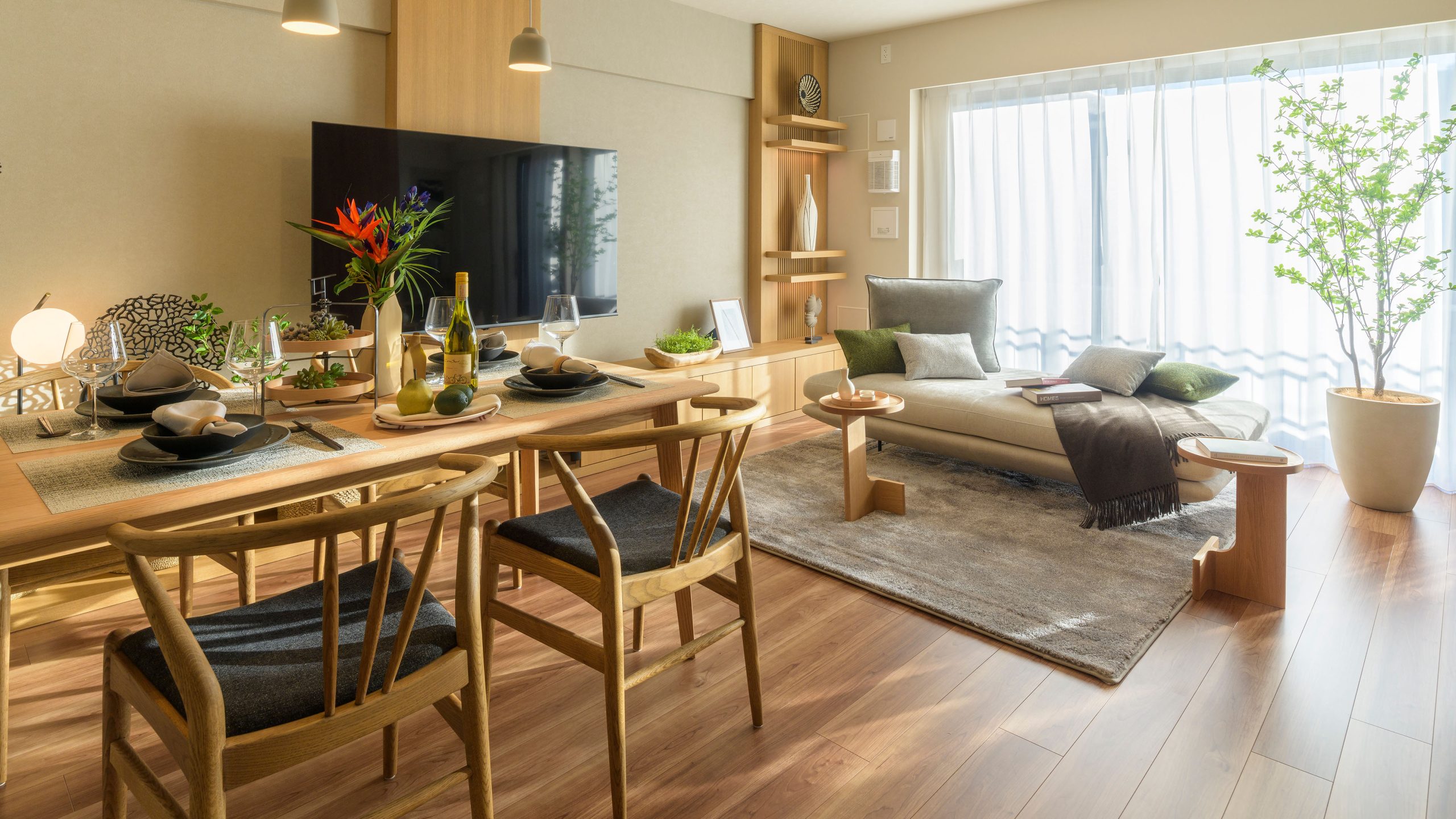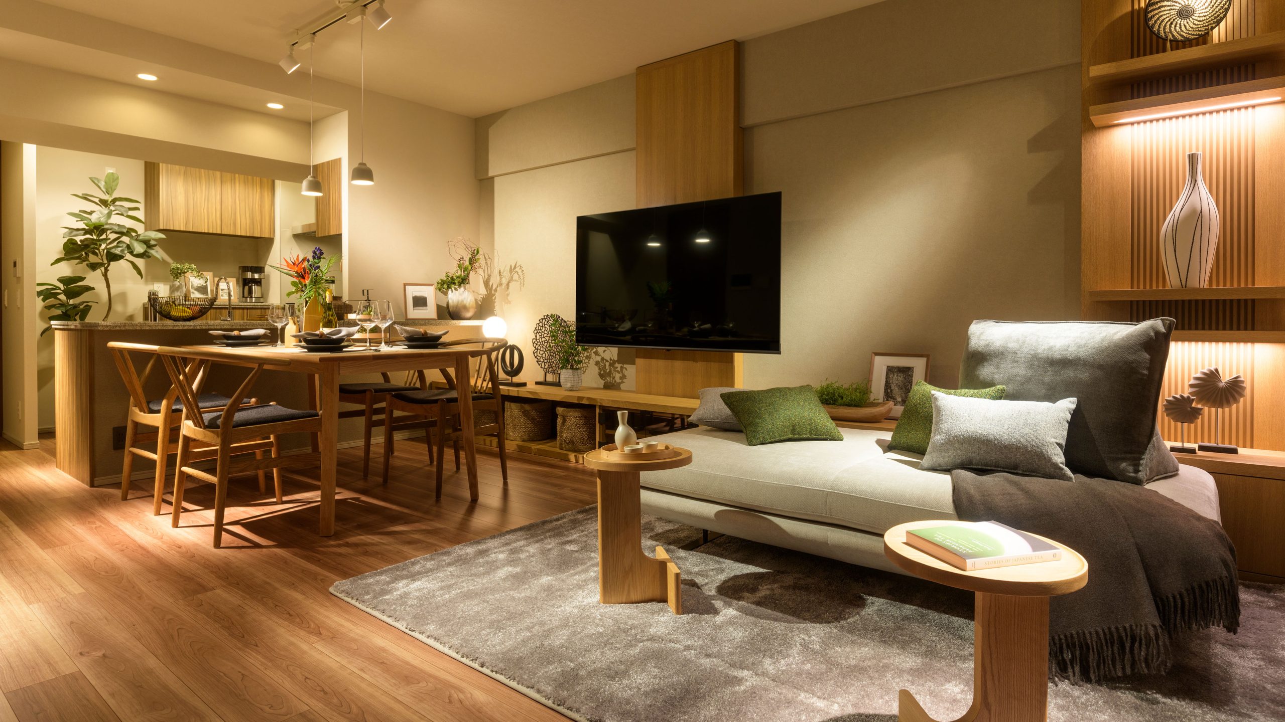 HALF MODEL ROOM ”With Japandi” __ 時を経て手元に残してきたものたちと、経験を積み重ねる中で培われた審美眼によって厳選したものたち。 日本的な懐かしさや親しみに、ほんの少しの新しさをプラス。 ゆとりを感じさせる暮らしにふさわしく、濃いめのオークの木の色味をベースに、 乾いた土のような質感やさらさらとした手触り、和を感じさせるアイテム、そして深いグリーンをアクセントに、心地よく過ごせるインテリアとした。