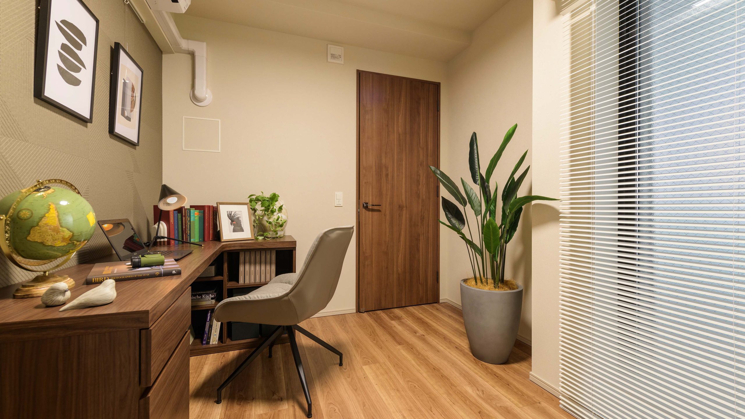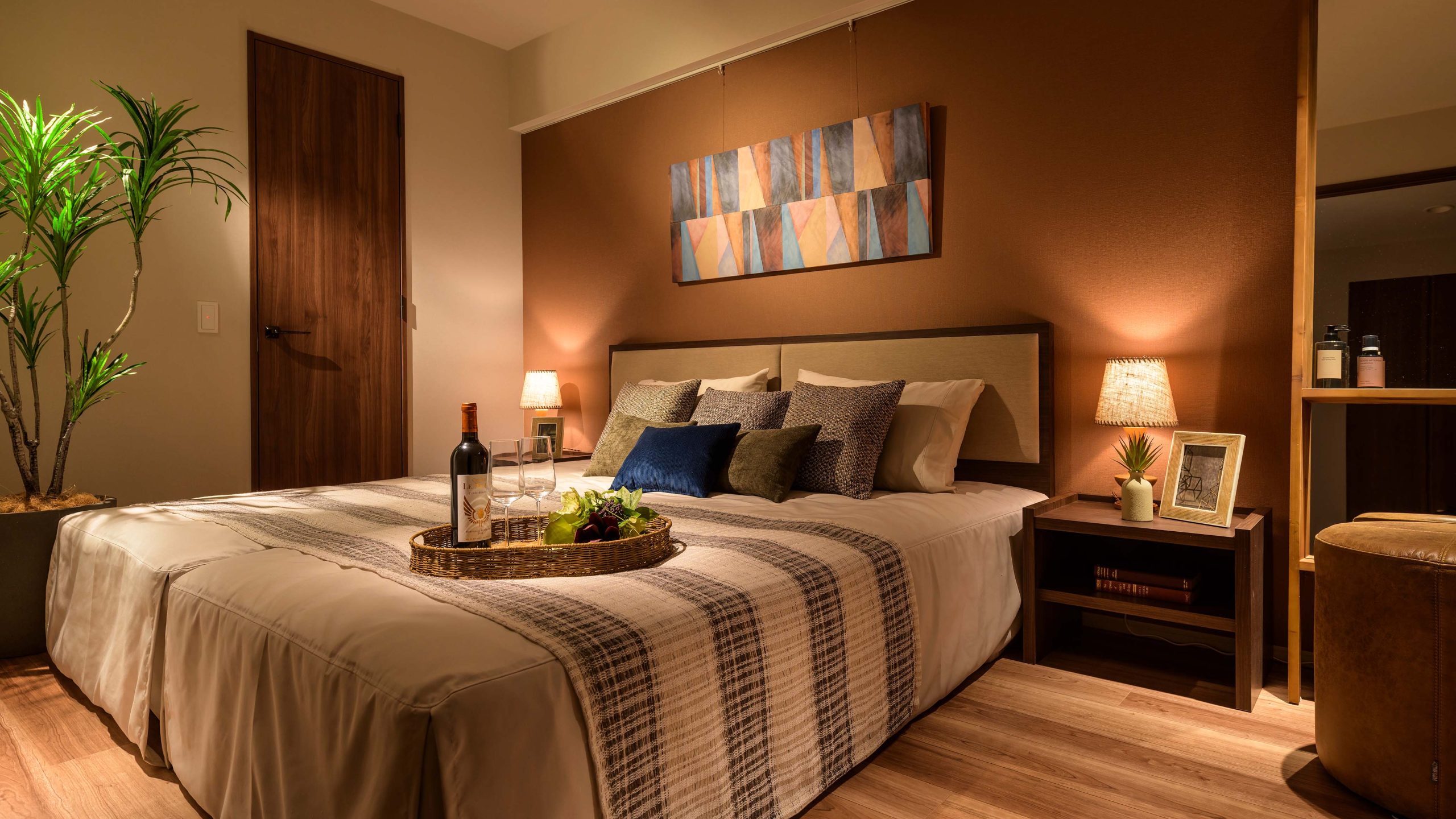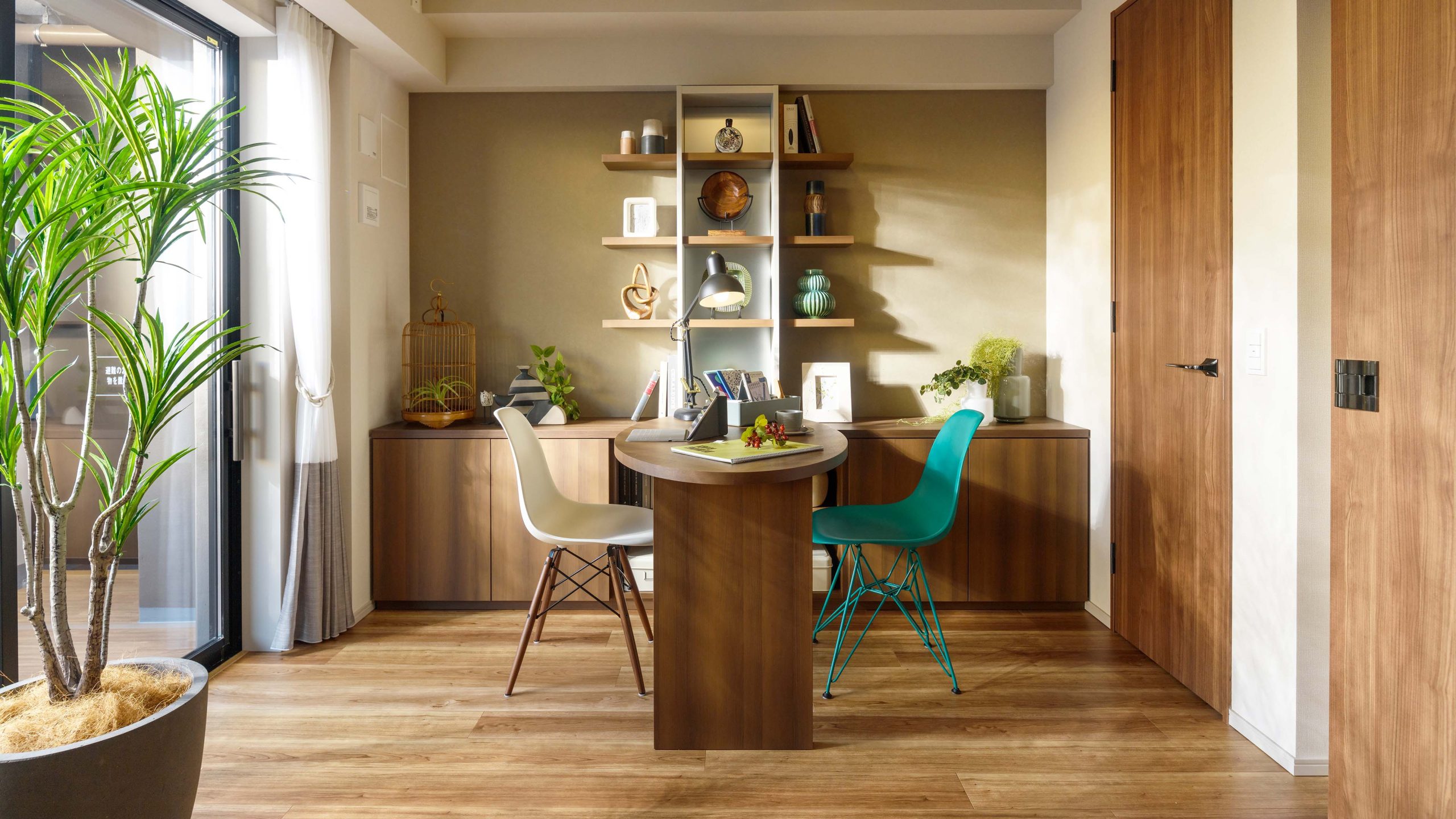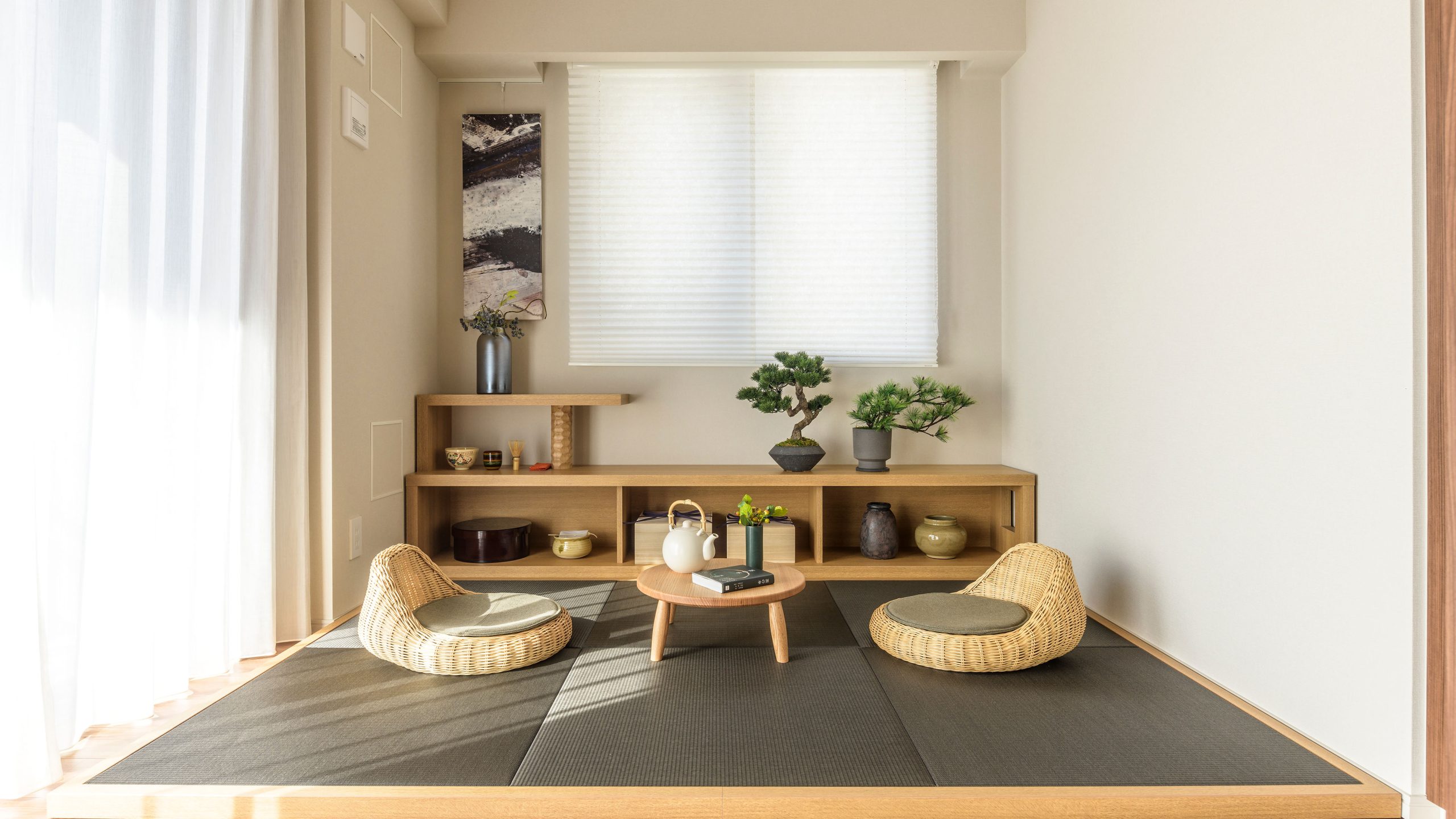 HALF MODEL ROOM ”With Japandi” __ 時を経て手元に残してきたものたちと、経験を積み重ねる中で培われた審美眼によって厳選したものたち。 日本的な懐かしさや親しみに、ほんの少しの新しさをプラス。 ゆとりを感じさせる暮らしにふさわしく、濃いめのオークの木の色味をベースに、 乾いた土のような質感やさらさらとした手触り、和を感じさせるアイテム、そして深いグリーンをアクセントに、心地よく過ごせるインテリアとした。