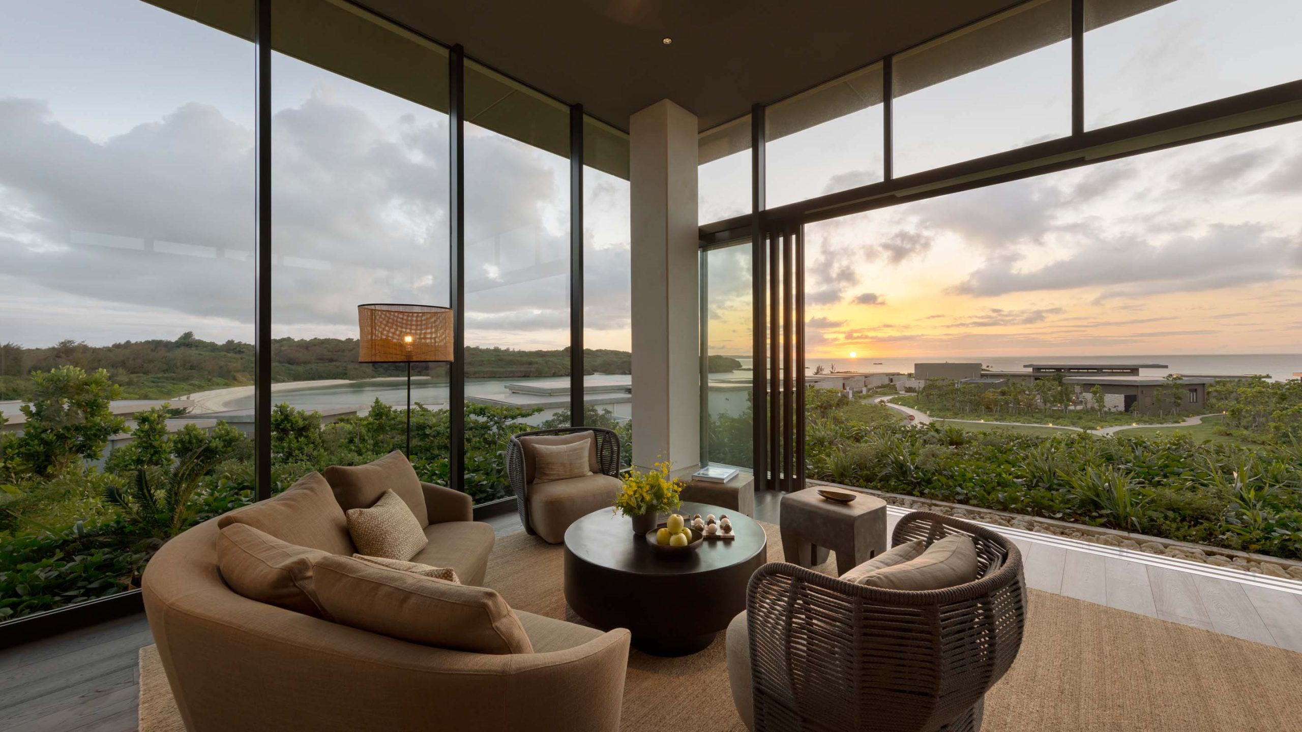 ホテルの最も高い場所に位置するウェルカムスペース。眼下に広がる宮古島の海とホテル全体を一望する贅沢な景色が、ここから始まる特別なリゾートステイを予感させる。