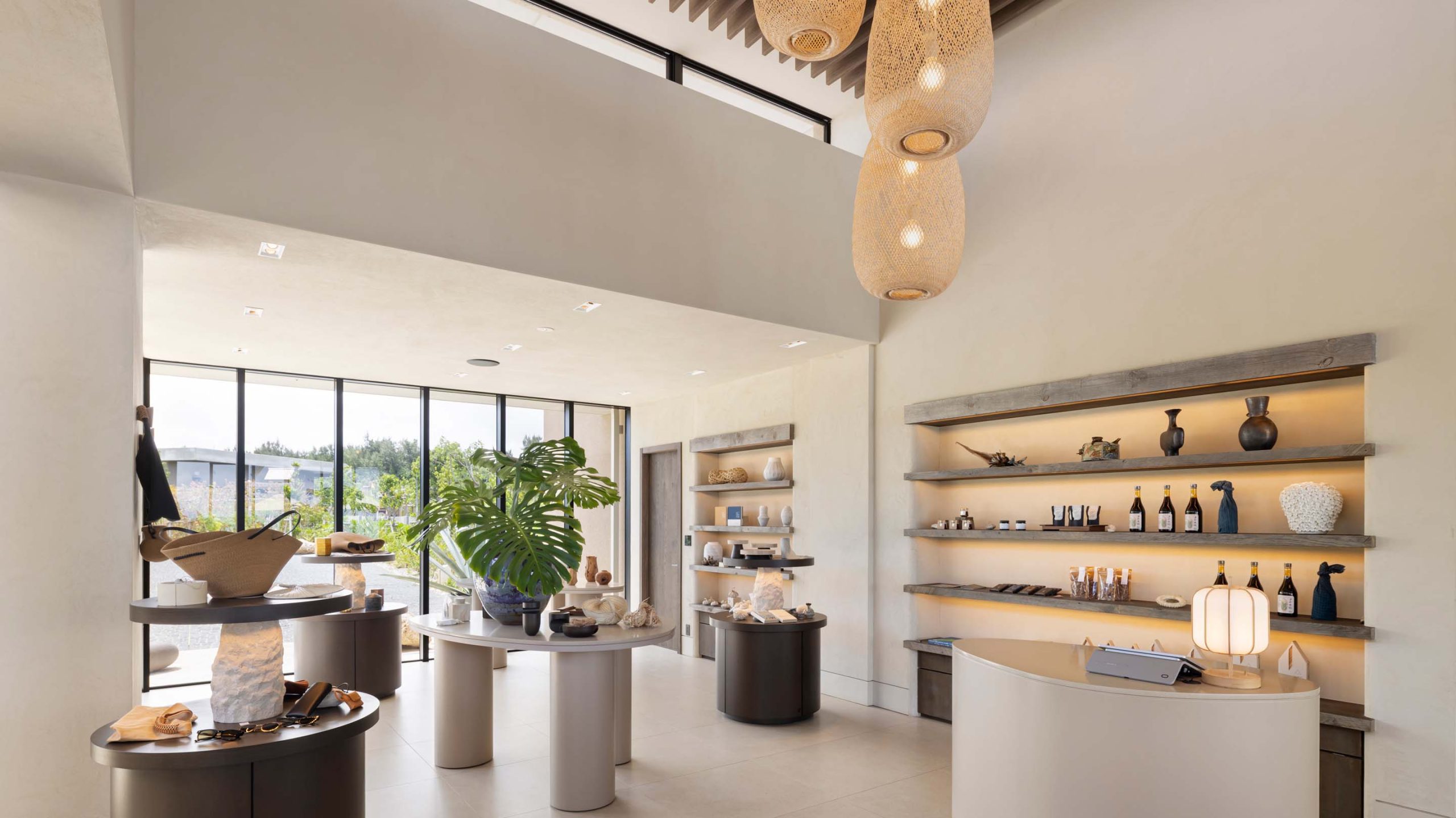 ショップエリアには厳選されたリゾートならではのアイテムが並ぶ。内装では、琉球石灰岩や質感のある素材を効果的に取り入れ、シンプルな空間の中に地域らしさを加えた。
