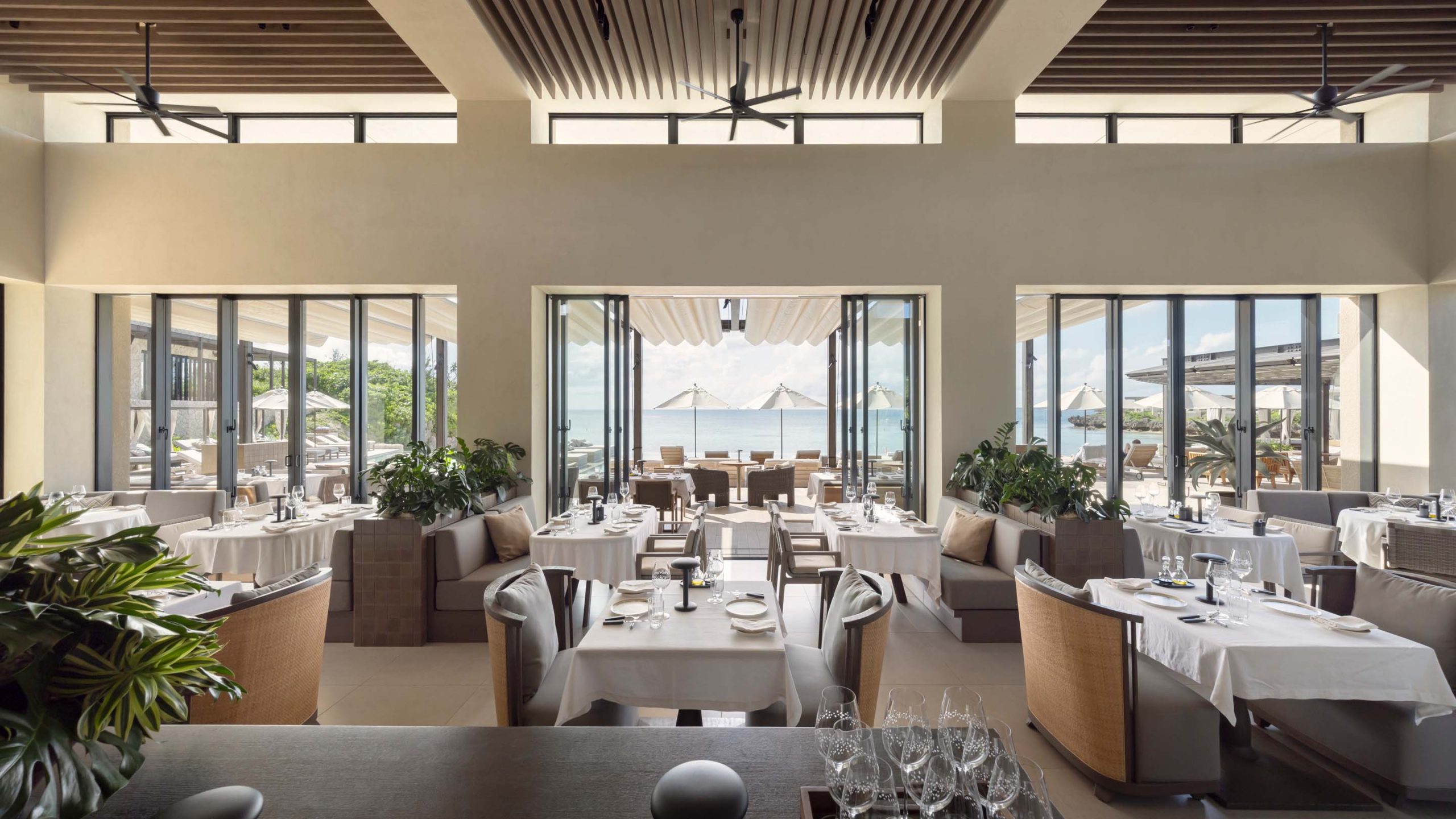 ホテルのメインダイニング。メインプールと海を眺めながら、このホテルの特徴である”外部とのつながり”を感じられる空間とした。
