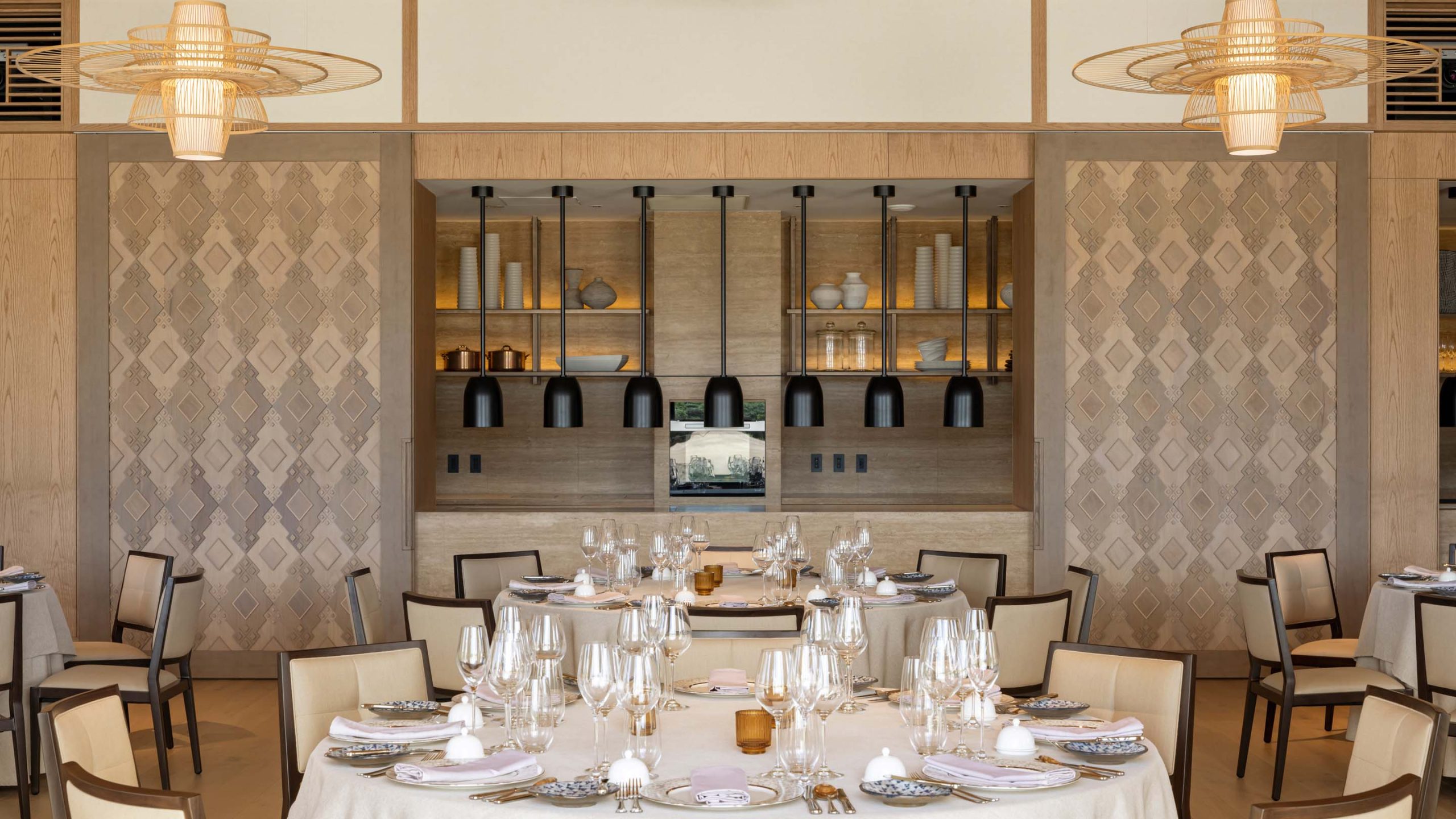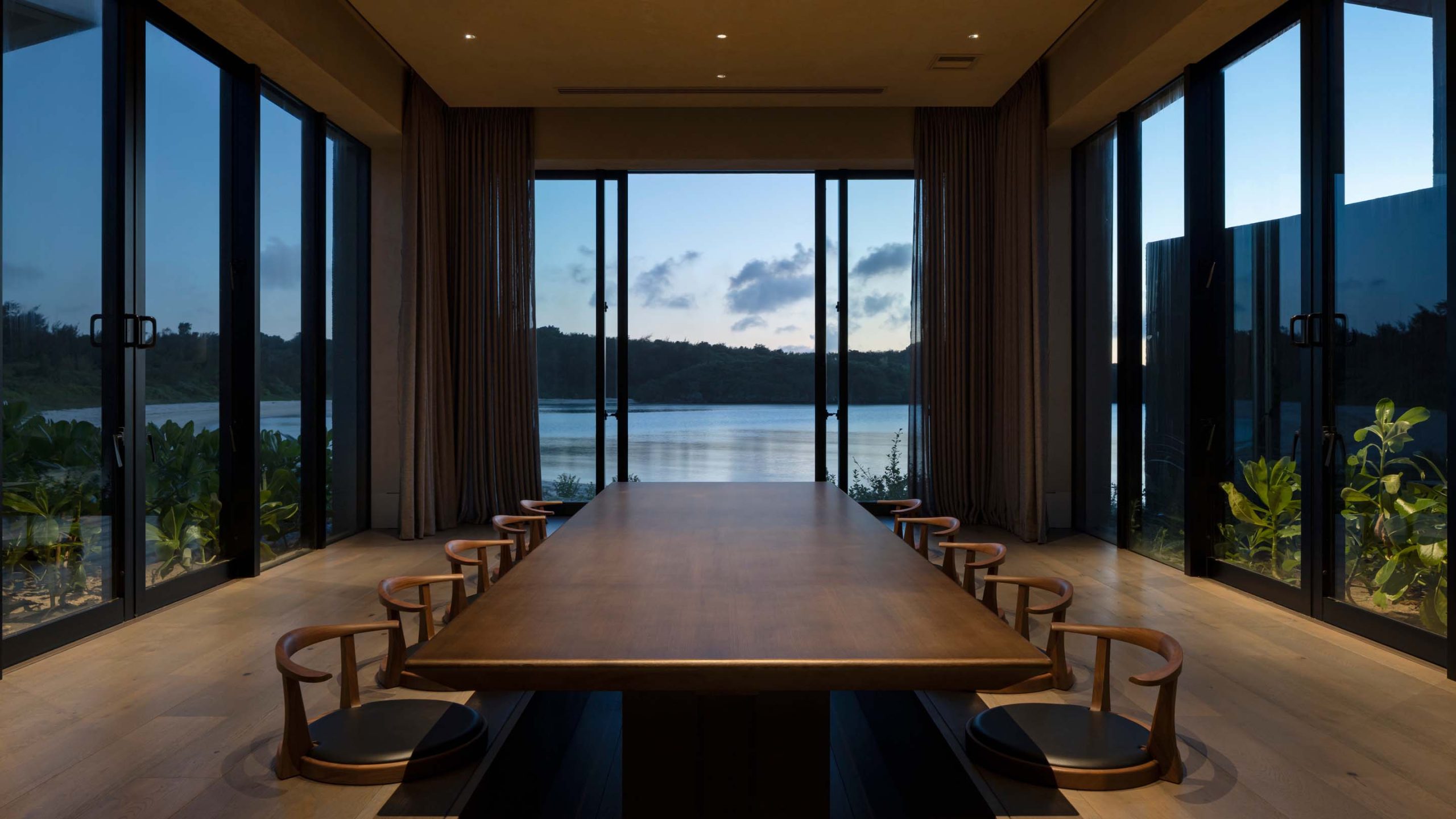 プライベートダイニングは、日本的な設えを意識したテーブルセッティングが特徴。視線が自然と低くなる構成とし、宮古島の海を眺めながら落ち着いて料理を味わえる空間とした。