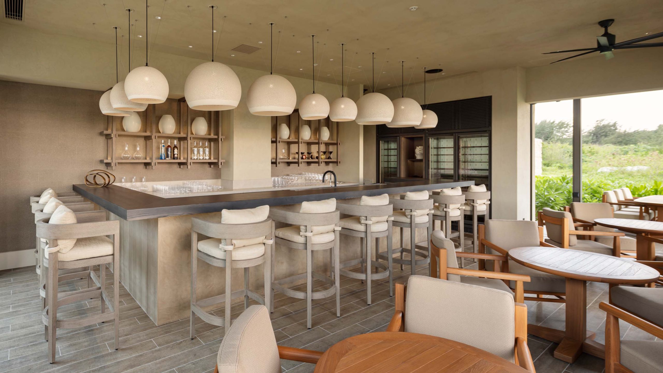 スペシャリティレストランエリアにあるBARでは表情のある照明やファブリックを採用し、よりリゾートの雰囲気を感じられる空間とした。