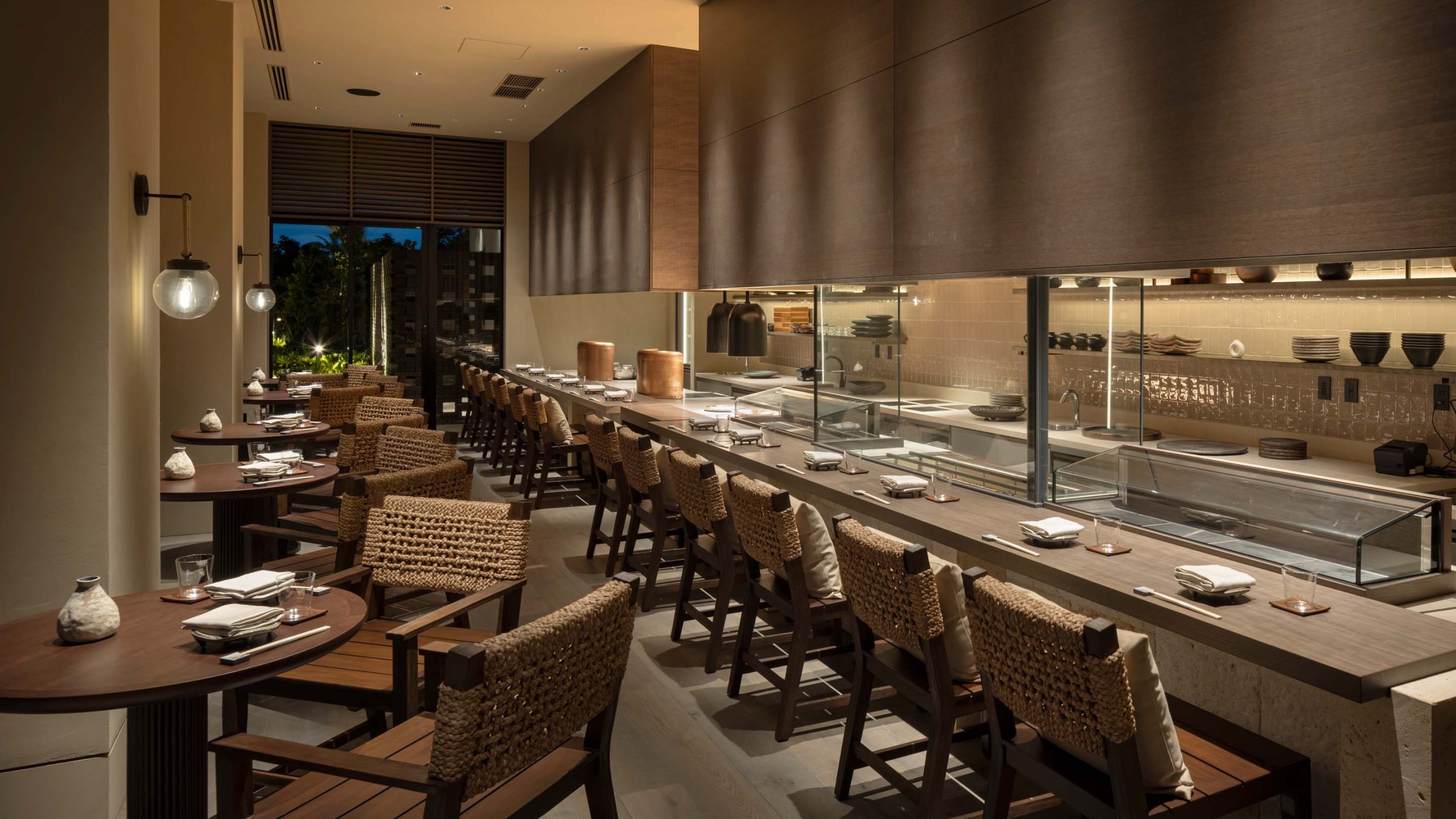 スペシャリティレストラン「苧麻」は、宮古島で作られている伝統的な織物である”宮古上布”に使われる植物名を由来とする店舗。空間の核となるロングカウンターには琉球石灰岩を用いた。