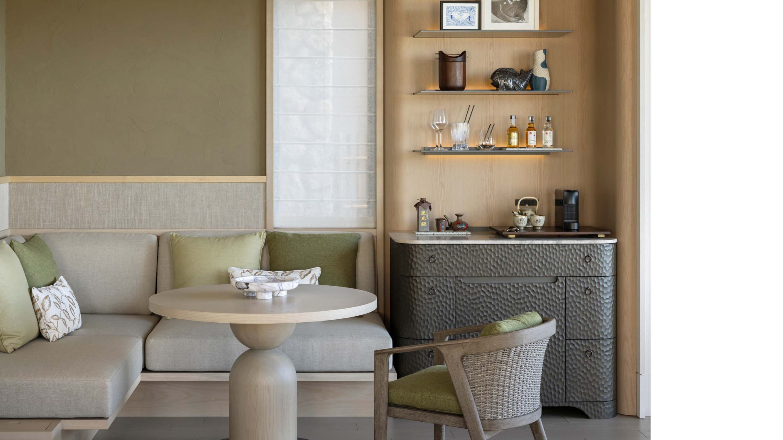 Villaのソファエリアには、日本の伝統的な木材加工技術である”名栗加工”が施された印象的なミニバーを設置した。木材の表面に独特な凹凸を施し、空間に温かみと深みを与えることで落ち着いて過ごせるエリアにまとまっている。