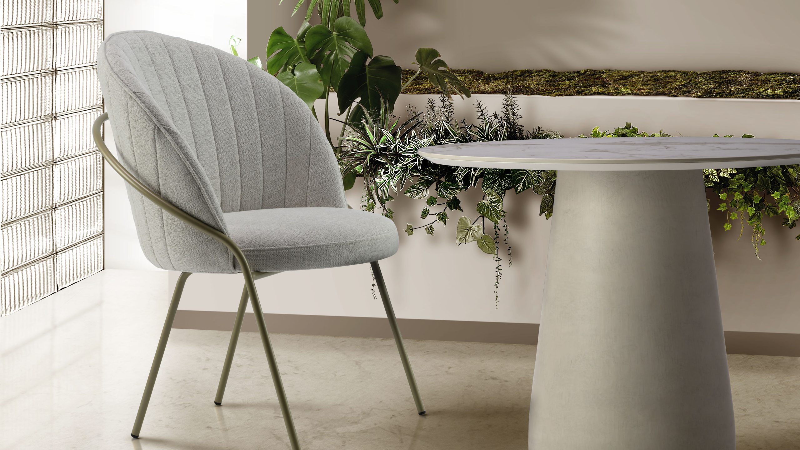 砂紋の生み出す自然の情景や静寂さからインスピレーションを受け、その場にある事で柔らかで繊細な空間を生み出す家具シリーズ。 背は椅子張りの技術を用いたボリューム感あるラインが身体を優しく包み込み、ダイニングやオフィスレセプション、ラウンジ等の幅広いシーンに調和する。 視覚・体感の双方から、心穏やかな時間を演出する。